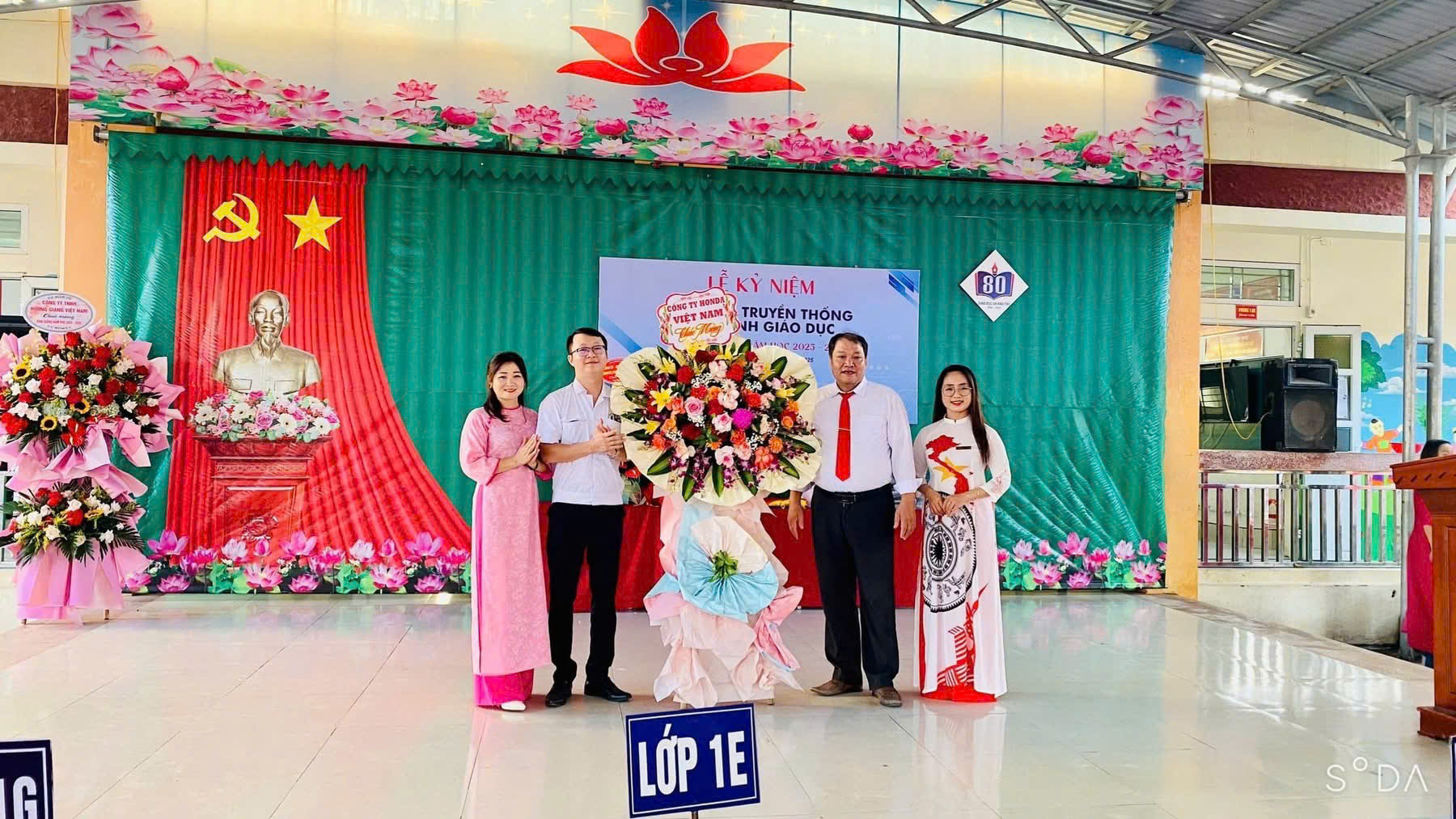 Tiếp theo, nhà trường được nhận những lẵng hoa tươi thăm đến từ các vị đại biểu đại diện ĐU, HĐND, UBND phường Đồng Văn, đại diện công ty Honda Việt Nam và Ban thường trực Hội CMHS nhà trường.